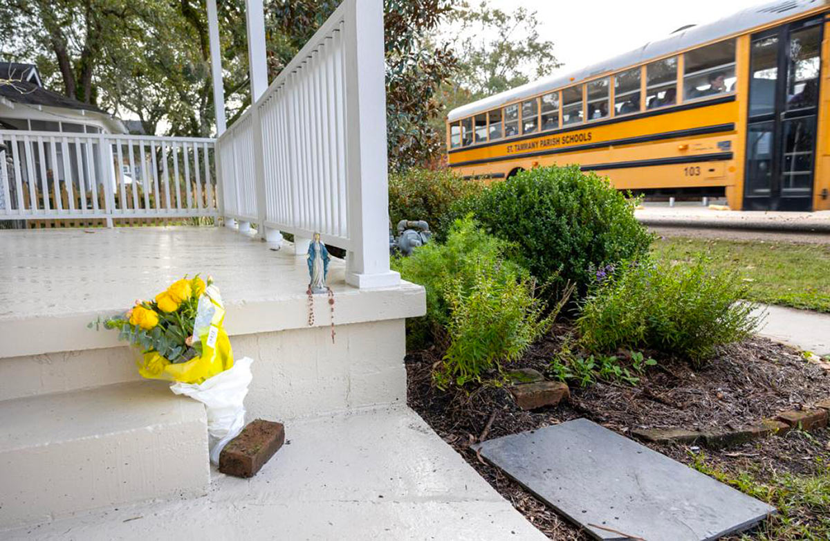 A St. Tammany Parish School bus passes in front of the home of Ruth Prats, a retired pastoral associate and director of ministries at St. Peter Catholic Church, where a rosary bead, a statue of Mary, and flowers were left on her front porch in Covington on Tuesday, November 29, 2022. (Photo by Chris Granger | The Times-Picayune | The New Orleans Advocate)