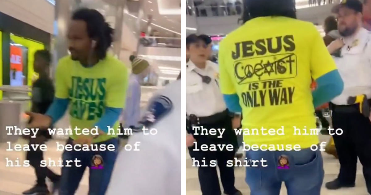 In a video Security guards told the man that other shoppers at the Minnesota mall said they were offended by the shirt. “Jesus is associated with religion and it’s offending people”. The man tried to reason with the guards, telling them that he didn’t speak or say anything to anyone — in terms of preaching.