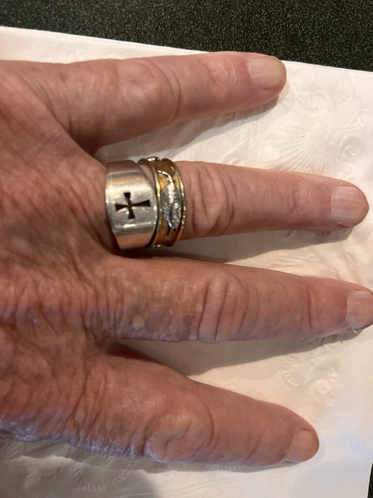 Okay, both of these folks wearing identical rings bought in Texas has to be more than a coincidence. I told my buddy about it and in about a week he handed me a small box and there was a shiny cross ring that he had ordered for me from a jewelry store in Kerr Texas and he refused to allow me to pay for it. I thanked him profusely and tried it on. Arghh… it was too small. He told me no problem and he sent it back and exchanged for another one that was one size larger.